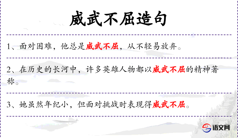 - 文化背景中,“威武不屈”常与中华民族的传统美德相联系,如坚韧不拔、勇往直前等。