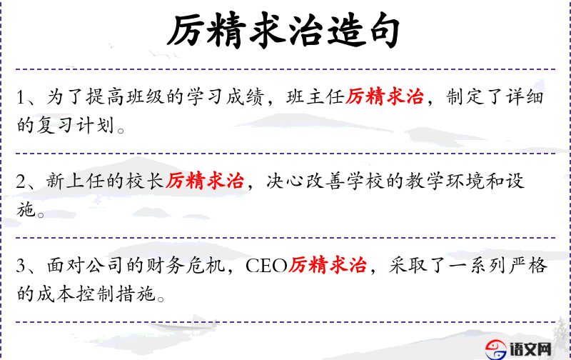 - 厉精求治:形容词短语,意为非常用心地追求完美。