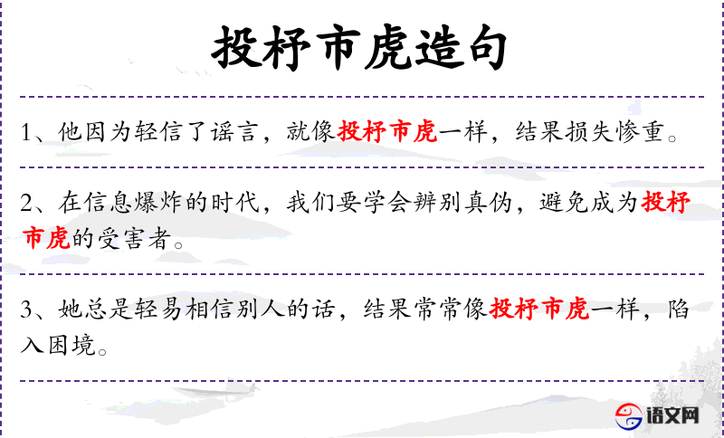- 投杼市虎:这个成语出自《战国策·齐策二》,讲述了一个人因为轻信谣言而误杀了无辜的人。这个成语强调了轻信谣言的危害。