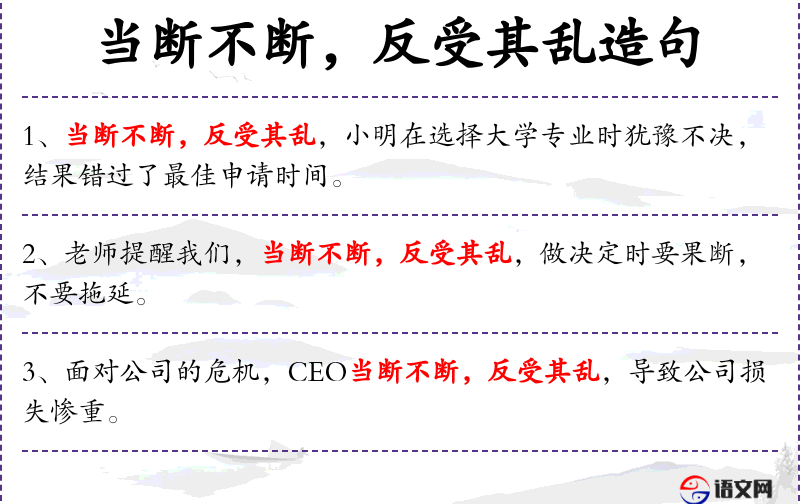 句子中的“当断不断,反受其乱”是一个成语,源自**古代的智慧,强调在关键时刻需要果断决策。这反映了中华文化中对决策和行动的重视。