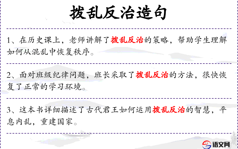 - 拨乱反治:指在处理问题时采取与常规相反的方法,通常用于形容处理复杂或棘手问题时的策略。