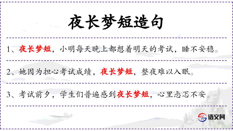 - “夜长梦短”是一个成语,用来形容焦虑时的主观感受。
