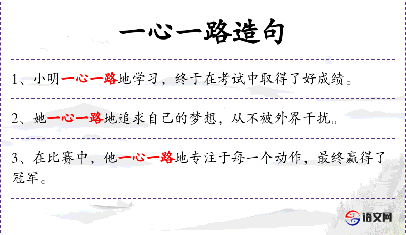 - 一心一路:形容专心致志,全心全意。