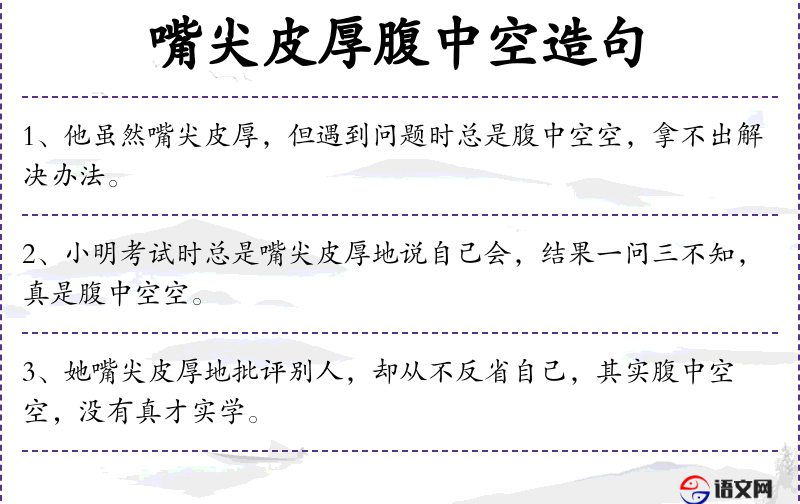 句子中“嘴尖皮厚”和“腹中空空”都是中文成语,反映了中华文化中对言行一致和真才实学的重视。这些成语在日常交流中常用来批评那些只说不做或缺乏真才实学的人。