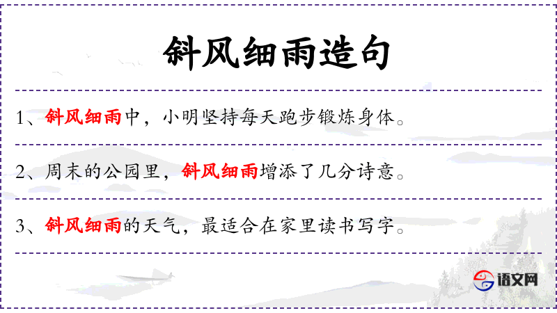1. 【斜风细雨】 形容微风夹着毛毛雨的天气。也比喻用温和舒缓的语气批评别人。