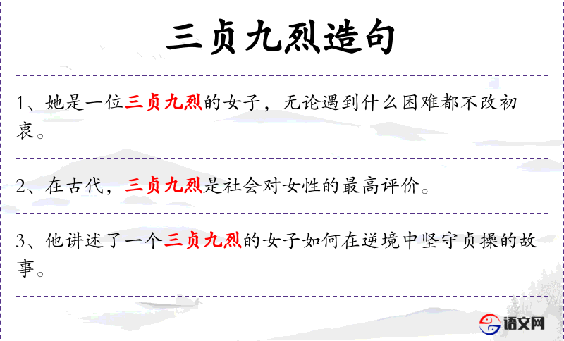 1. 【三贞九烈】 贞:贞操;烈:节烈。封建社会用来赞誉妇女的贞烈。