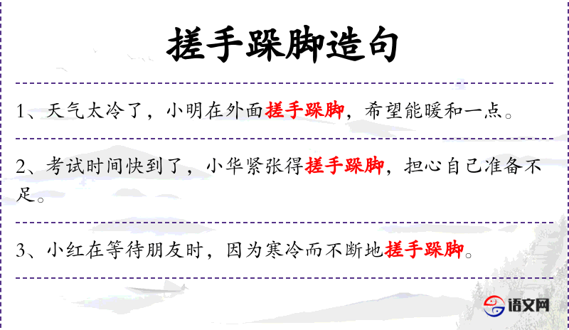 - 搓手跺脚:动词短语,表示紧张或焦虑的行为