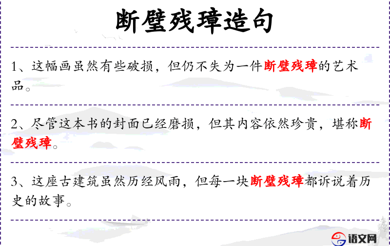 句子:“这座古城的遗址中,每一块断璧残璋都见证了曾经的辉煌。”