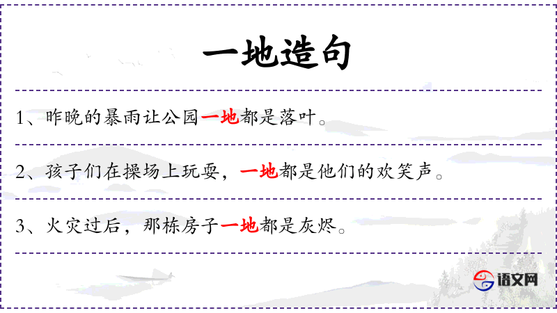 1. 【一地】 - 一处地方; 同一地方; 到处; 犹一味,总是; 犹满地。