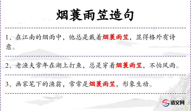 3. 【烟蓑雨笠】 - ①指蓑衣斗笠两种雨具。②借指隐者的服装或隐者优游自适的生活。
