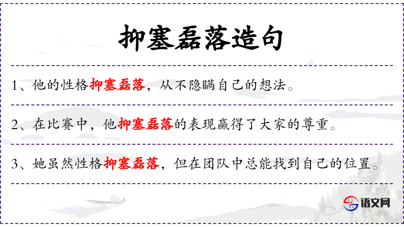 - 抑塞磊落:这是一个形容词短语,用来形容一个人的性格直率、坦诚,不隐藏自己的情感或想法。