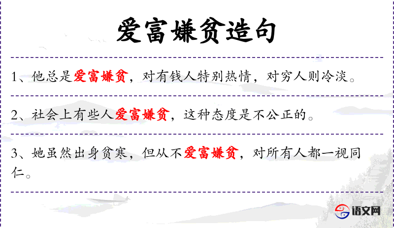 1. 【爱富嫌贫】 - 嫌弃贫穷,喜爱富有。指对人的好恶以其贫富为准。