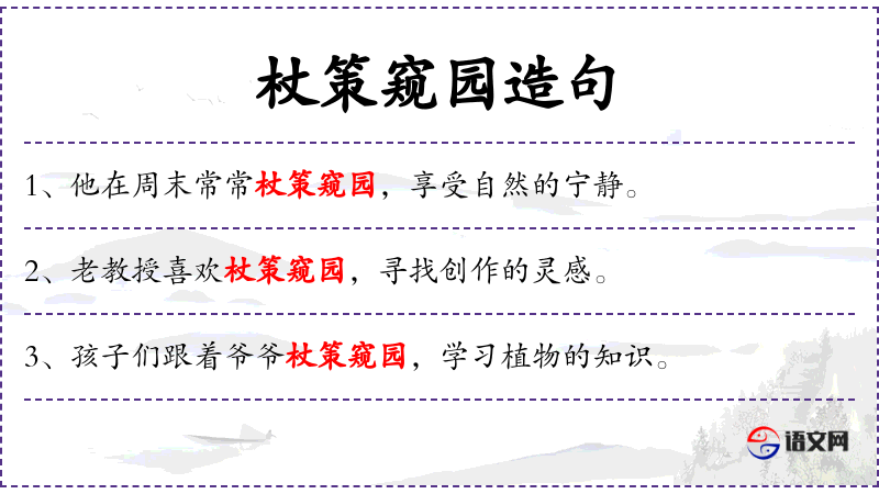 1. 【杖策窥园】 - 杖策:拄杖。扶着拐杖,也要去园中看看。指不读死书,而是要观察、了解社会。