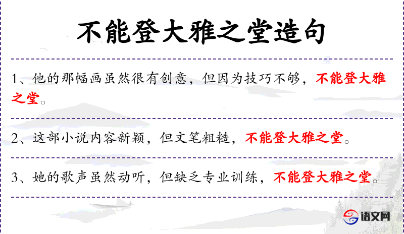 - 大雅之堂:这个成语源自**传统文化,比喻高雅、正式的场合或水平。在现代汉语中,常用来形容事物尚未达到一定的标准或水平。