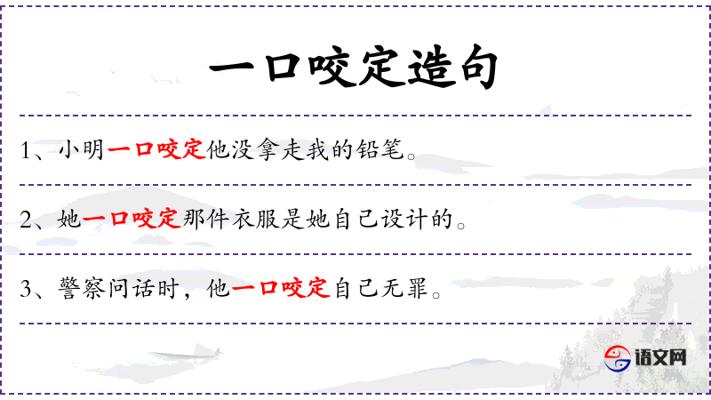 1. 【一口咬定】 一口咬住不放。比喻坚持一个廉洁,再不改口。