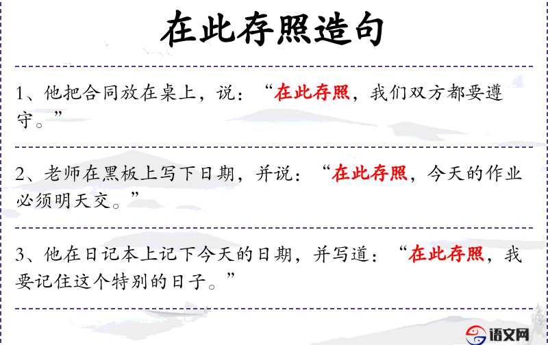 - 在此存照:固定短语,表示在此留下记录或证据。