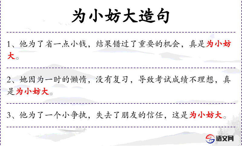 成语“为小妨大”是文化中常用的一个表达,用来告诫人们不要因为眼前的小利益而忽视了更大的利益。这个成语反映了人重视长远规划和整体利益的价值观。