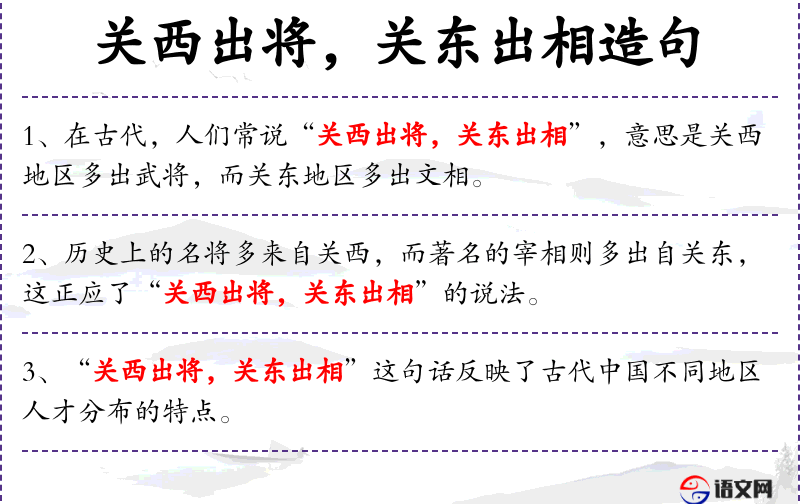 句子:“在古代,人们常说“关西出将,关东出相”,意思是关西地区多出武将,而关东地区多出文相。”