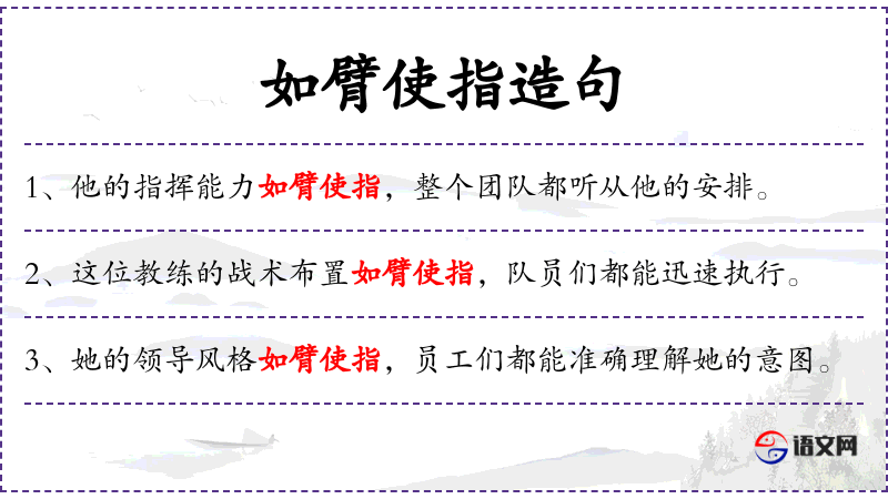 在不同语言中,成语“如臂使指”的翻译可能会有所不同,但核心意义保持一致,即战术布置得非常熟练和有效。