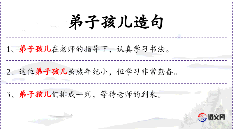 句子:“弟子孩儿们排成一列,等待老师的到来。”