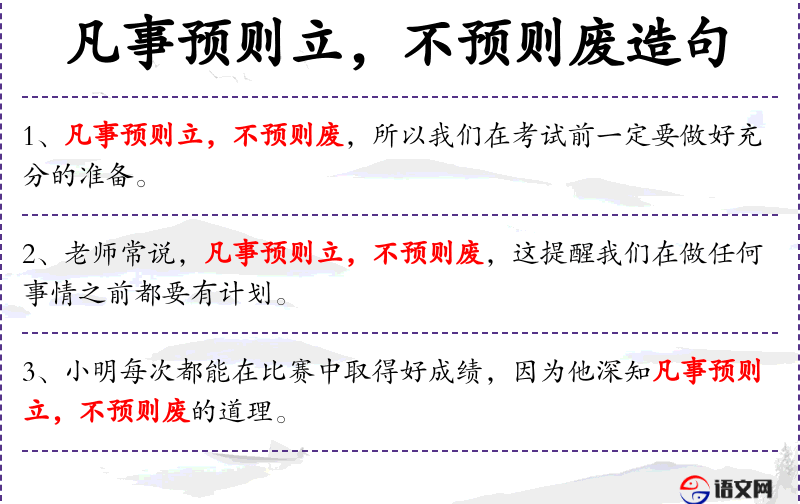 - 凡事预则立,不预则废:成语,意思是凡事提前准备就能成功,不提前准备就会失败。