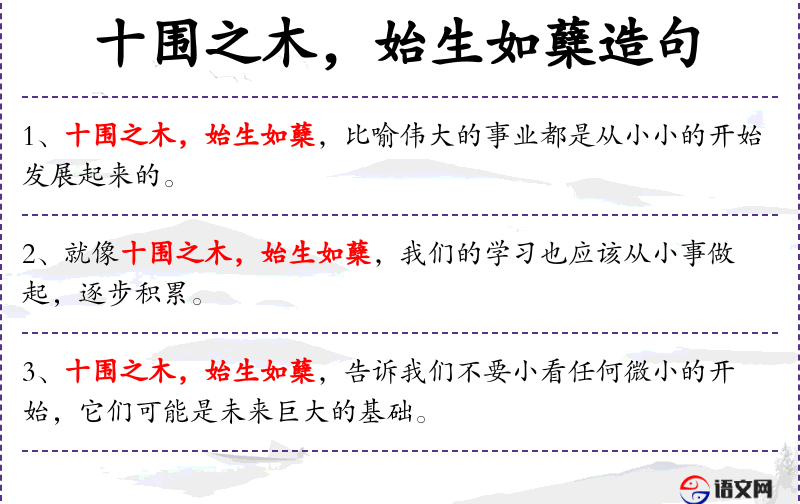 - 比喻成分:就像十围之木,始生如蘖