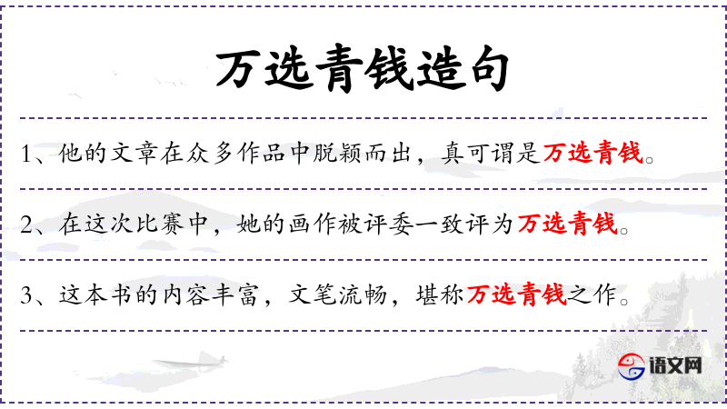 - 万选青钱:比喻在众多选择中脱颖而出,特别优秀。青钱指古代的铜钱,因其色泽青绿而得名,这里比喻优秀。