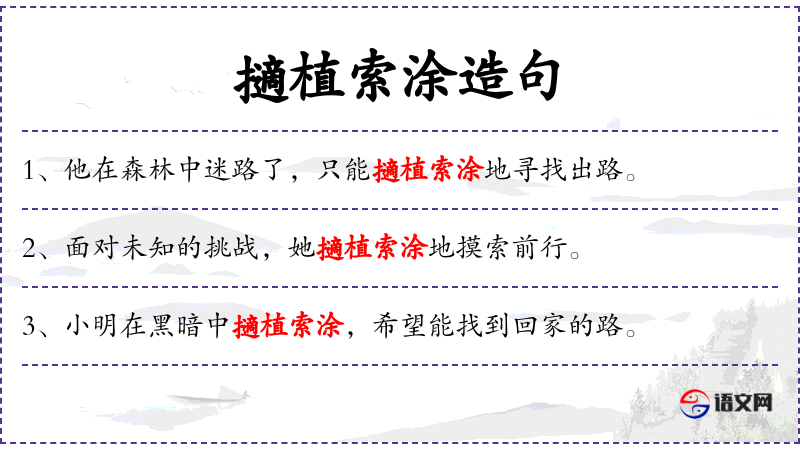 - 擿植索涂:成语,意为摸索前进,形容在困境中寻找出路。