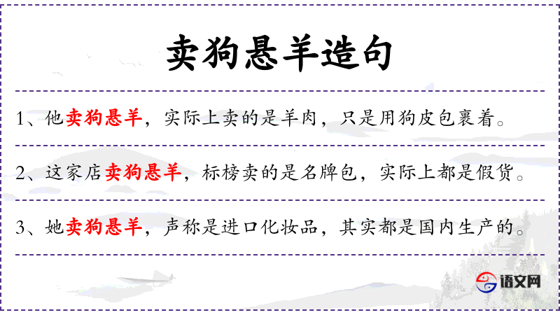 句子:“他卖狗悬羊,实际上卖的是羊肉,只是用狗皮包裹着。”