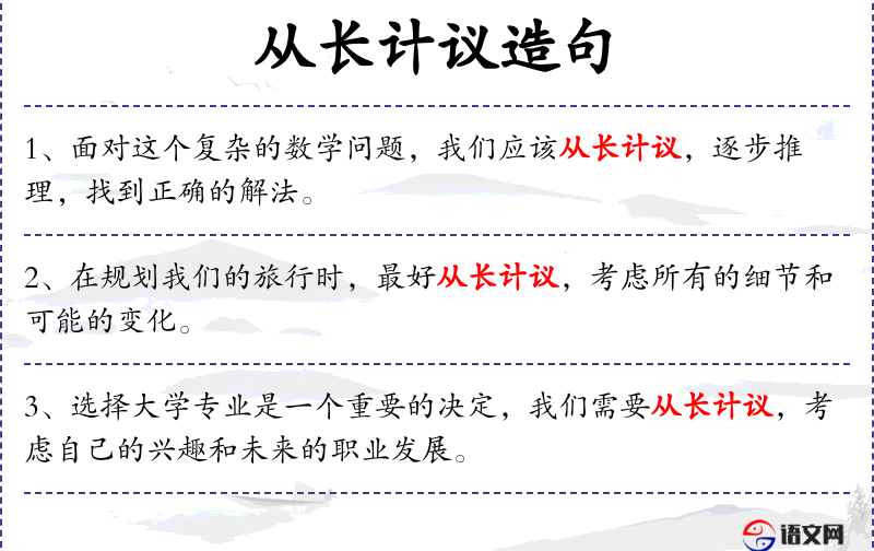 1. 【从长计议】 用较长的时间慎重考虑、仔细商量。