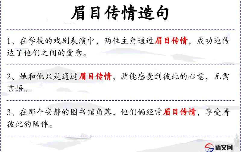 8. 【眉目传情】 用眼色传递情意。多用于男女之间。