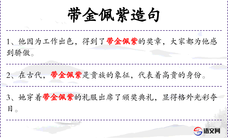 - 金佩紫:名词短语,金和紫是颜色,佩指佩戴,整体指佩戴金色和紫色的装饰品。