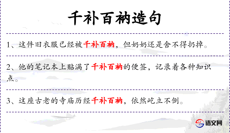 - 宾语:无直接宾语,但“千补百衲”作为补语,描述主语的状态。