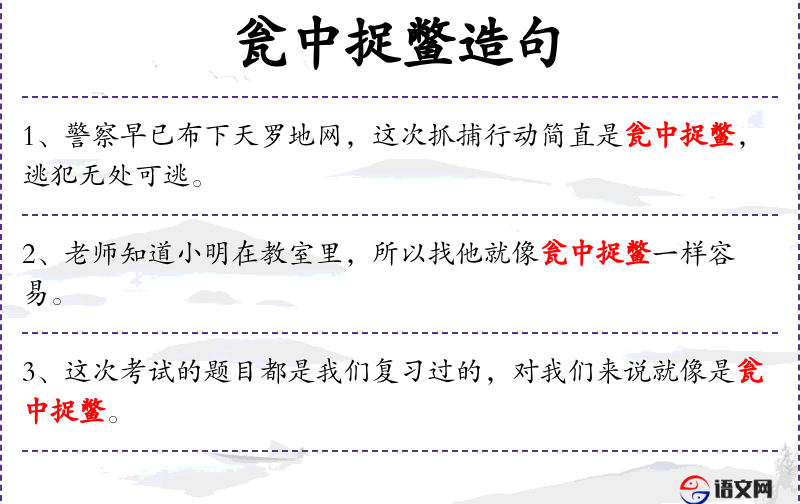 5. 【瓮中捉鳖】 从大坛子里捉王八。比喻想要捕捉的对象已在掌握之中。形容手到擒来,轻易而有把握。