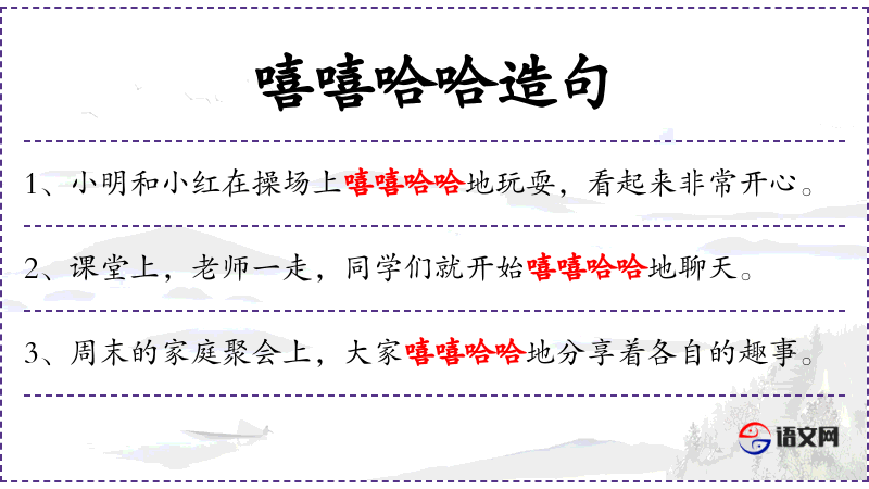 - 嘻嘻哈哈:形容笑声,表示开心、欢乐。