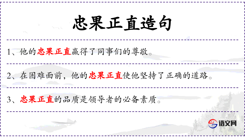 - 忠果正直:这个词组描述了一种高尚的道德品质,意味着忠诚、果断和正直。