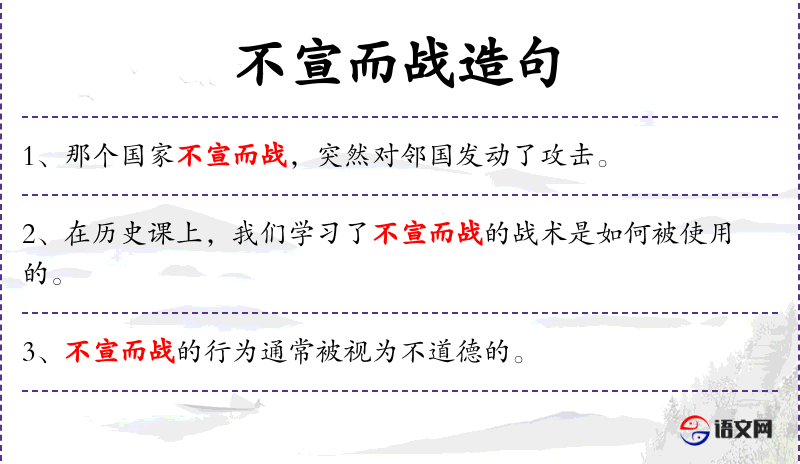 - 不宣而战:指未经正式宣战就发起的战争,通常被视为不正当或不道德的行为。