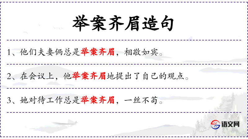 - 举案齐眉:源自《左传·宣公十五年》,形容夫妻间互相尊重。