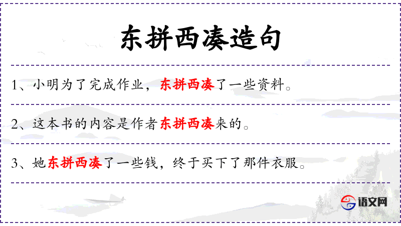 - 谓语:东拼西凑