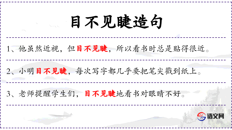 3. 【目不见睫】 - 自己的眼睛看不到自己的睫毛。比喻没有自知之明。也比喻只见远处,不见近处。