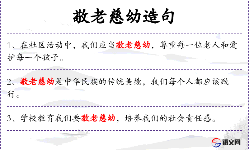 3. 【敬老慈幼】 敬:尊敬;慈:怜爱。尊敬老人,爱护儿童。