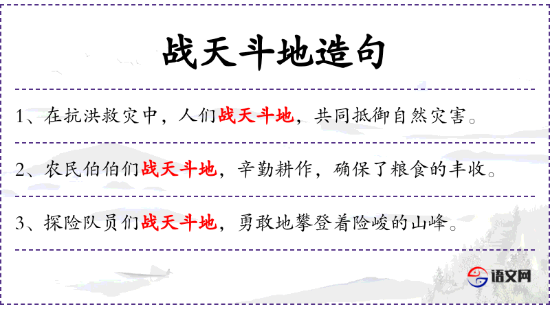- 战天斗地:这个成语源自**传统文化,强调不畏艰难,勇往直前。
