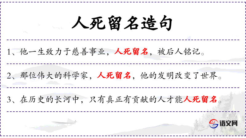 “人死留名”这个表达在**文化中意味着一个人虽然去世,但他的成就和名声仍然被后人记住。这与西方文化中的“legacy”或“immortal”概念相似。