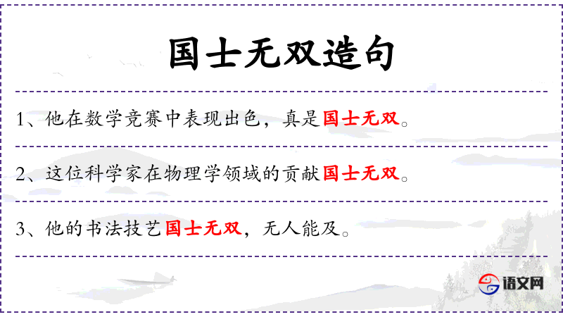 - 国士无双:成语,形容某人在某一领域无人能及。
