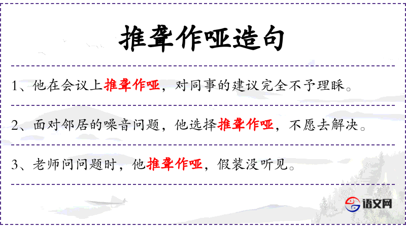 - 英文:使用“pretends to be deaf and mute”直接表达了“推聋作哑”的意思,而“completely ignoring”则对应“不予理睬”。