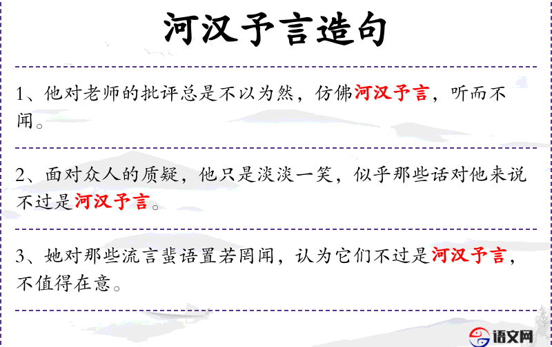 4. 【河汉予言】 河汉:银河,比喻言论虚夸迂阔,不着边际。把这话看作不实的言论,不重视。