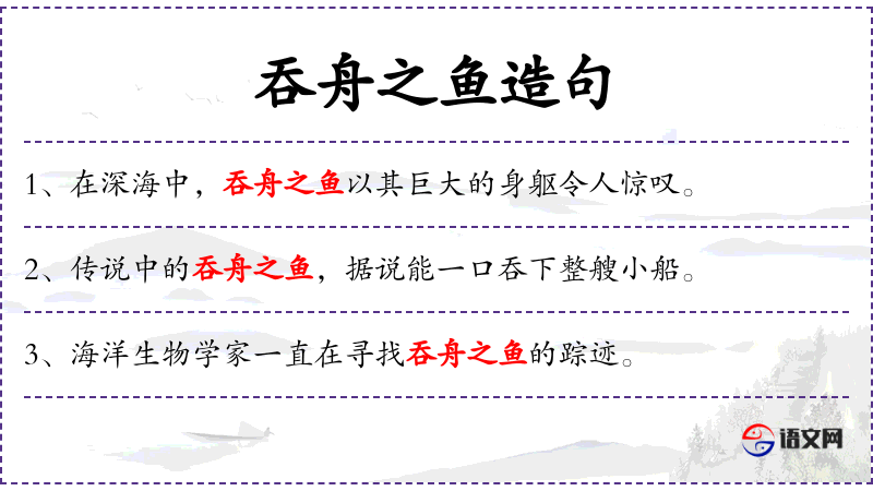 - 宾语:老人讲述的吞舟之鱼的传说故事