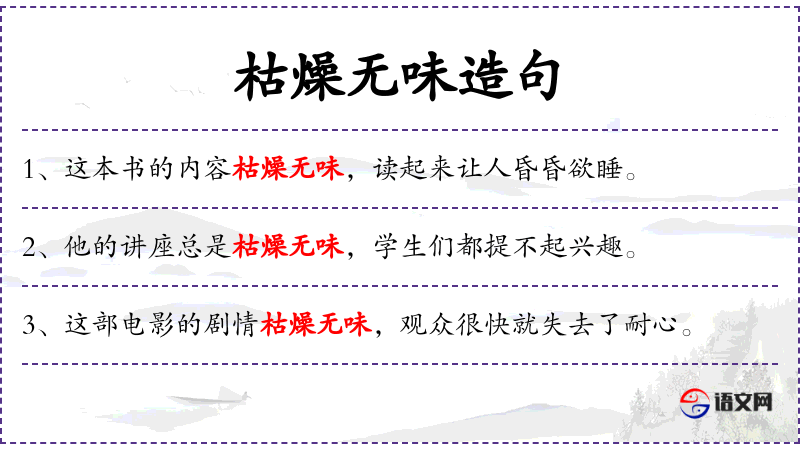 2. 【枯燥无味】 - 枯燥:单调。形容单调,没有趣味。