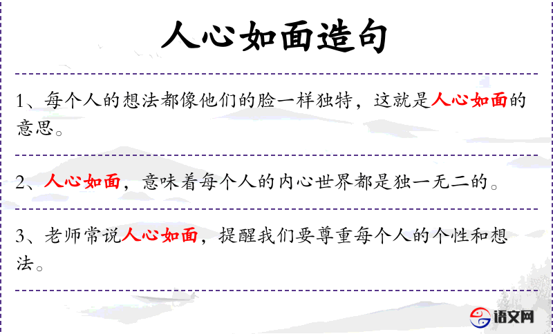 - 人心如面:这个成语源自**文化,强调人的内心世界和外在表现一样多样。在西方文化中,类似的表达可能是“每个人的思想都是一幅独特的画”。