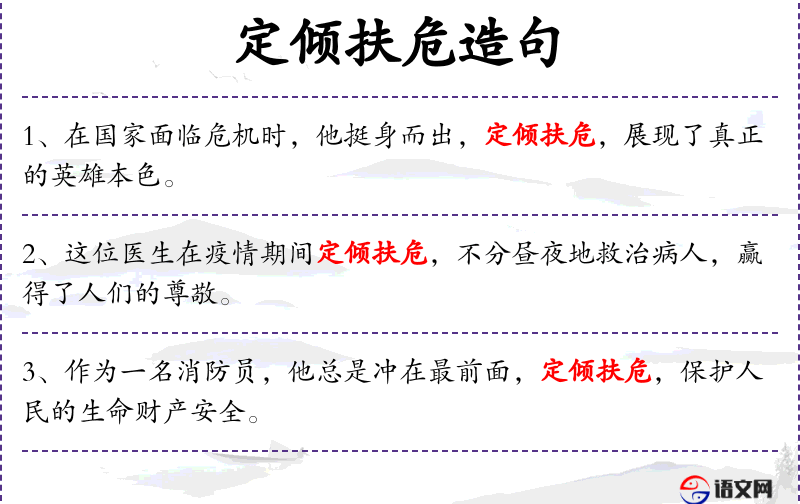 句子:“在国家面临危机时,他挺身而出,定倾扶危,展现了真正的英雄本色。”